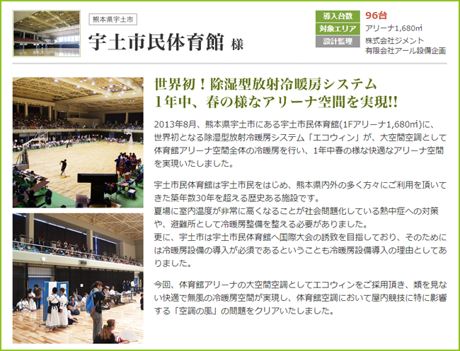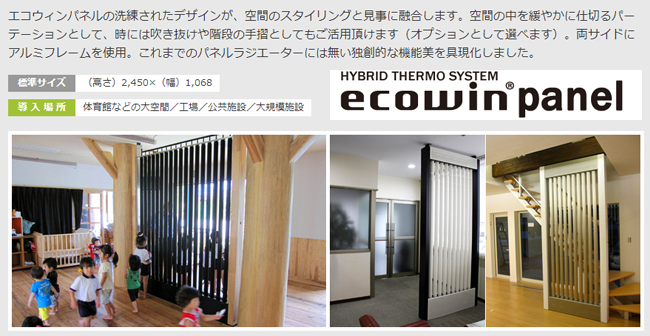 エコウィンとは弊社独自技術による、地球にも人にもやさしい輻射式(放射式)冷暖房システムです。 体育館などの公共施設から介護老人保健施設、医療関係施設、事務所や賃貸マンションまで、さまざまな施設で利用されています。